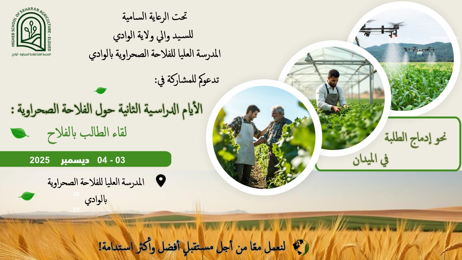 اليوم الأول : 03 ديسمبر 2025 الفترة الصباحية 09:00 - 12:30 : تتمثل نشاطات الفترة الصباحية في : - الإفتتاح . - كلمة السيد مدير المدرسة . - كلمة السيد الوالي . - مداخلة لعرض نتائج الإستبيانات وإحصاء الإشكاليات الفلاحية المتعلقة بالصحة النباتية والإنتاج الحيواني. - استراحة قهوة . - مداخلات . - نقاش . - وجبة غذاء – فندق الوادي الفترة المسائية : 14:00 - 17:00 : تتمثل نشاطات الفترة المسائية في تنظيم ورشات وهي : - الورشة 1: الإشكاليات الفلاحية المتعلقة بالصحة النباتية - الآفات الحشرية. - الورشة 2: الإشكاليات الفلاحية المتعلقة بالصحة النباتية - أمراض النباتات. - الورشة 3: الإشكاليات الفلاحية المتعلقة بالصحة النباتية - الأعشاب الضارة. - الورشة 4: اﻷشكاليات الفلاحية المتعلقة بالإنتاج الحيواني. - توزيع شهادات مشاركة على الفلاحين اليوم الثاني : 04 ديسمبر 2025 تتمثل نشاطات اليوم الثاني في تنظيم الورشات التالية : الفترة الصباحية 09:00 - 12:00 : - الإشكاليات الفلاحية المتعلقة بالصحة النباتية. - الإشكاليات الفلاحية المتعلقة بالإنتاج الحيواني . - وجبة غذاء . الفترة المسائية : 12:00 - 14:00 : - تلاوة التوصيات . - تسليم الشهادات . - الإختتام