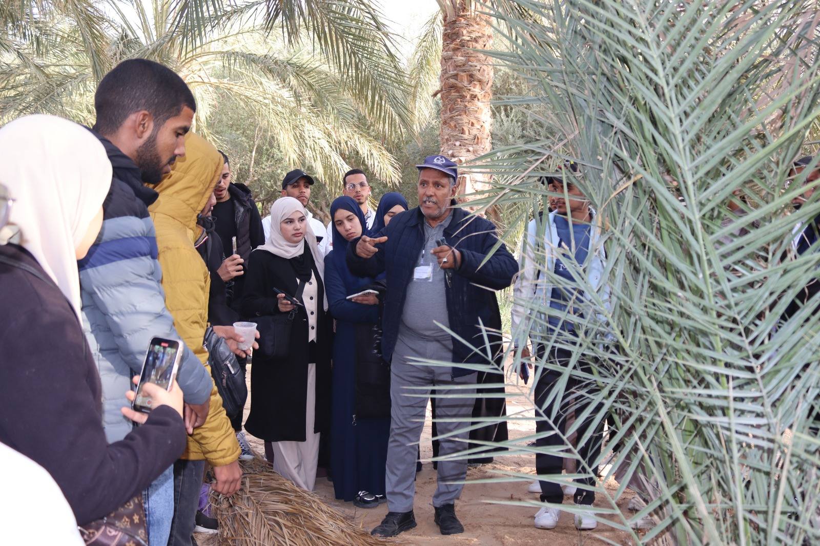 The afternoon session of the first day of the workshop included a field visit to one of the farms in El Oued Province. During this visit, fourth-year students, specializing in Plant Protection Engineering at the Higher School of Saharan Agriculture in El Oued, benefited from detailed explanations provided by Mr. Abdel Sattar CHERIF, Senior Agricultural Engineer at the Directorate of Agricultural Services of El Oued Province, and Professor Kamal BEN SALAH from the Scientific and Technical Research Center for Arid Regions (CRSTRA) in Biskra, focusing on pests affecting date palms.