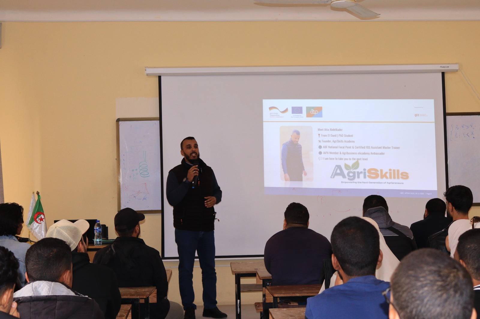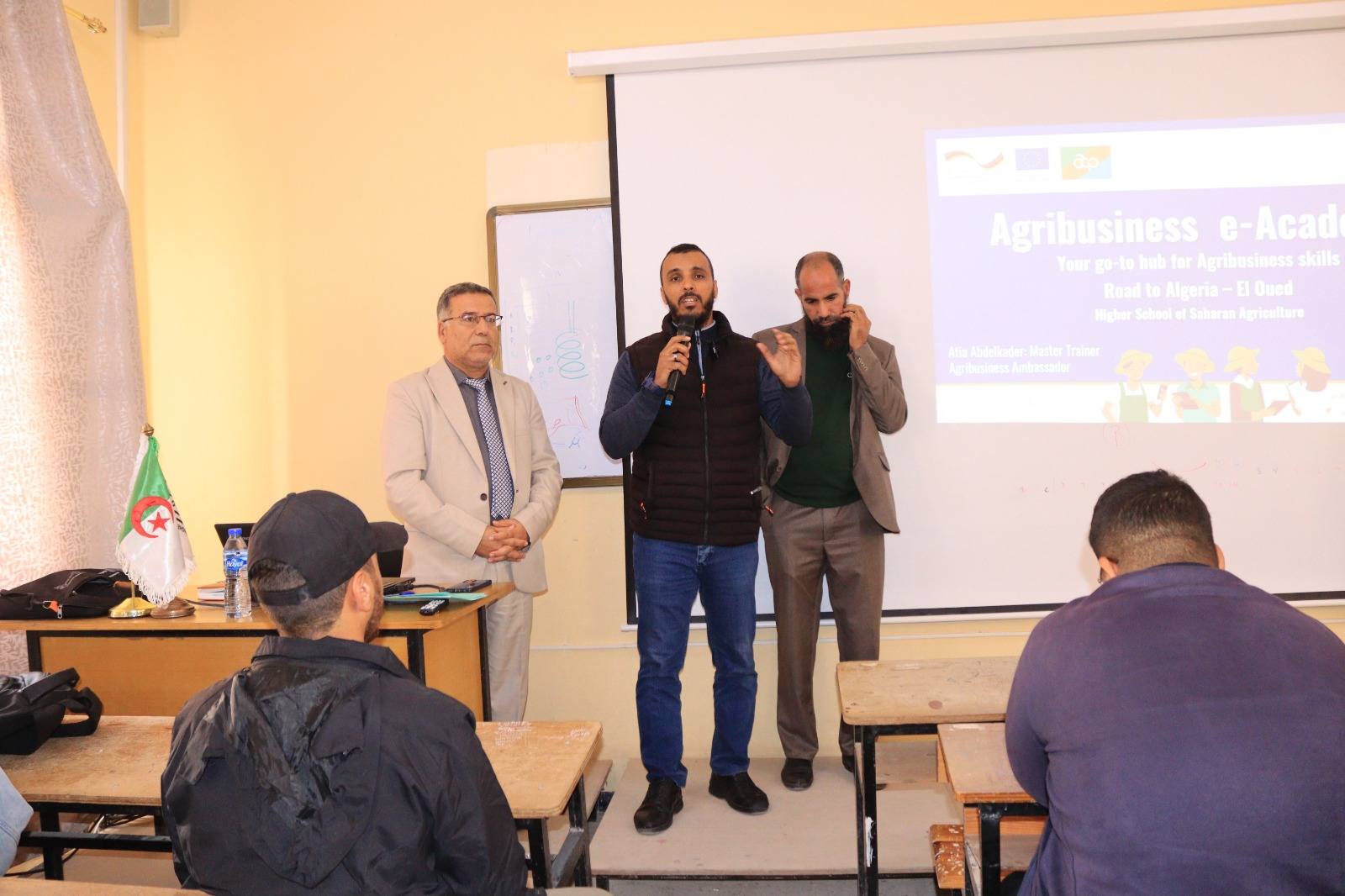 As part of the ongoing activities of Global Entrepreneurship Week, and under the supervision of the Director of the Higher School of Saharan Agriculture in El Oued, Professor Elhabib GUEDDA, the fourth day of the event featured the organization of the workshops: _ The first workshop, led by Mr. Abdelkader ATTIA, was entitled " Agro-business et Academia" _ The second workshop, delivered by Dr. Mekki ZBIDI, focused on "Business Models and the BMC ( Business Model Canvas)"
