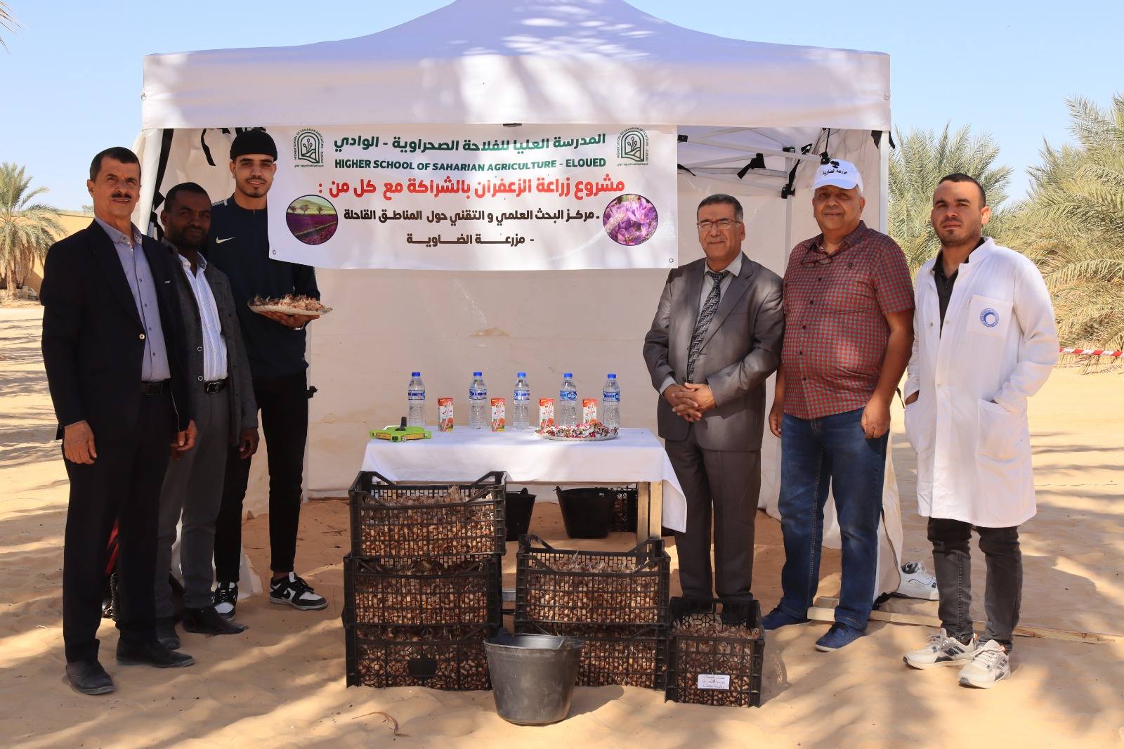A significant joint project has been launched at El-Dhawya model farm, bringing together the Higher School of Saharan Agriculture in El Oued and the Scientific and technical Research Center on Arid Regions (CRSTRA) to initiate the cultivation of Saffron. The project was implemented by a group of students under the supervision of the school's agricultural engineer, Mr. Ali MOUSSAOUI, was officially inaugurated in the presence of the School Director, Professor Elhabib GUEDDA, the Deputy Director for Pedagogy, Professor Soufiane SEGGAI, the School Secretary General, Mr. Mokhtar BEN HALIMA, as well as the manager of the model farm El-Dhawya, Mr. Belkheir.