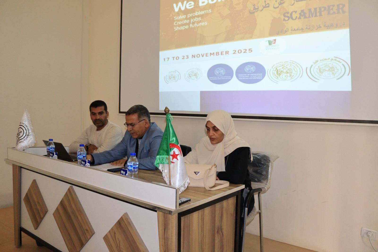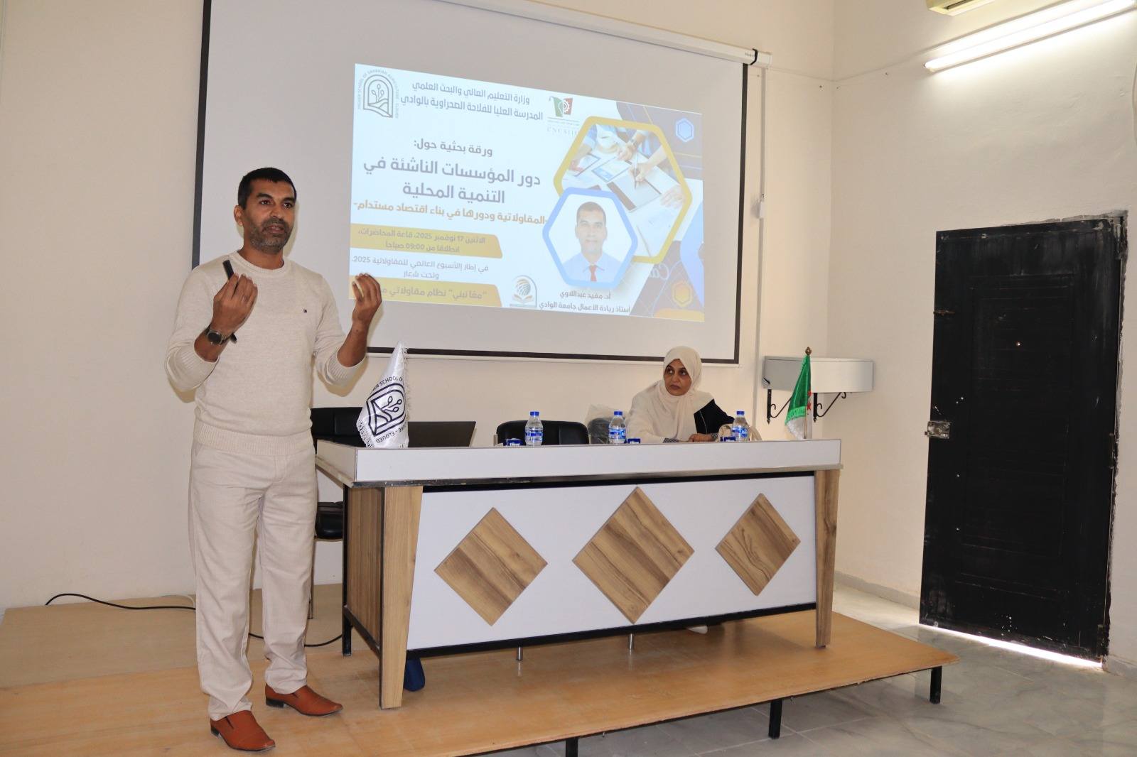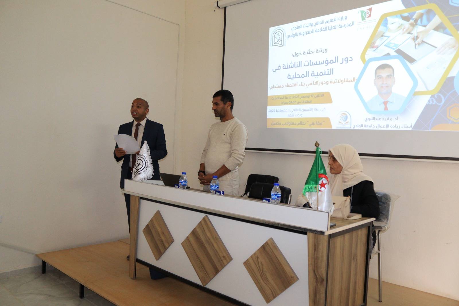 The Higher School of Saharan Agriculture in El Oued officially launched the activities of Global Entrepreneurship Week today, Monday, 17 November 2025. The opening ceremony began with an address by the School Director, Professor Elhabib GUEDDA, who welcomed the guests and emphasized the importance of cultivating an entrepreneurial mindset among students. This was followed by remarks from the Deputy Director for Scientific Research, Dr. Ibrahim El-Khalil BAHMENE, who highlighted the crucial role of entrepreneurship as a driving force for the national economy, particularly in the agricultural sector. After the welcoming speeches, Professor Moufid ABDELLAOUI delivered a presentation entitled "The Role of Startups in Local Development." In addition, Dr. Wahiba KHAZAZNA presented an intervention aligned with the theme of Global Entrepreneurship Week: "Together We Build a Complete Entrepreneurial Ecosystem."