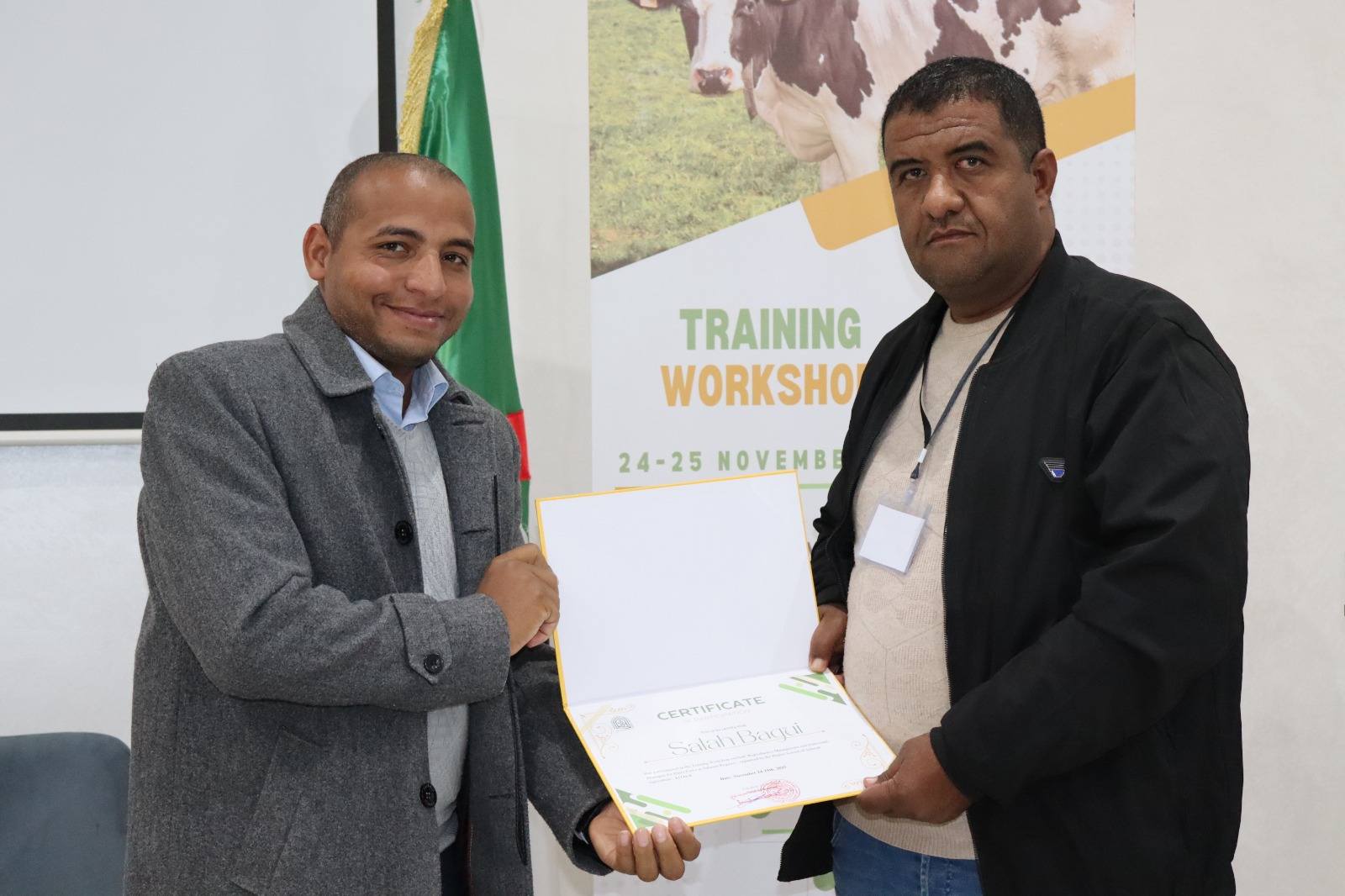 Reproductive Management and Feeding Strategies for Dairy Cattle in Saharan Regions The second day of the training workshop (Tuesday, 25 November 2025) featured an applied field lecture for students entitled " Feeding Dairy Cattle." The session was delivered by one of Algeria's distinguished scientific figures, Professor Fodil ARBOUCHE, whose expertise enriched the participant's practical understanding of the topic. At the end of the workshop, a concluding session was held, during which the outcomes and recommendations of the program were presented by Professor Samia MELLIANI. This was followed by a ceremony honoring all those who contributed to the success of this event, including faculty members, veterinarians, and cattle breeders. The session took place in the presence of the School Director, Professor Elhabib GUEDDA, along with his deputies and the School's Secretary General.