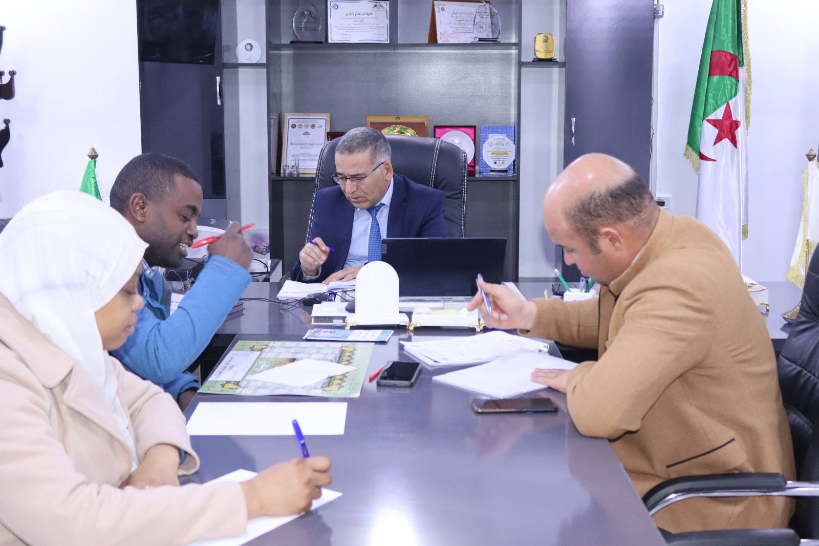 As part of the regular coordination meetings held with the various administrative divisions of the Higher School of Saharan Agriculture in El Oued, the School Director, Professor Elhabib GUEDDA, convened a meeting on Monday, February 16, 2026, with members of the Pedagogical Affairs Directorate. The meeting was attended by the Assistant Director for Pedagogy, Professor Sofiane SAGGAI, the Head of the Second Cycle Department, Dr. Hafsa BENRAS, and the Head of the Common Core Training Department, Dr. Abdelbasset KADDOUR. This meeting provided an opportunity to review the outcomes of the first semester, highlighting its strengths while identifying shortcomings, their underlying causes, and possible solutions to address them in the upcoming semester. It also served as a platform to refine certain organizational aspects to ensure the smooth running of pedagogical activities. In this context, the Director emphasized the importance of discipline in carrying out responsibilities and the need for continuous monitoring of academic duties to guarantee a standard of training that meets both local and national expectations, in line with the recommendations of the supervising ministry.